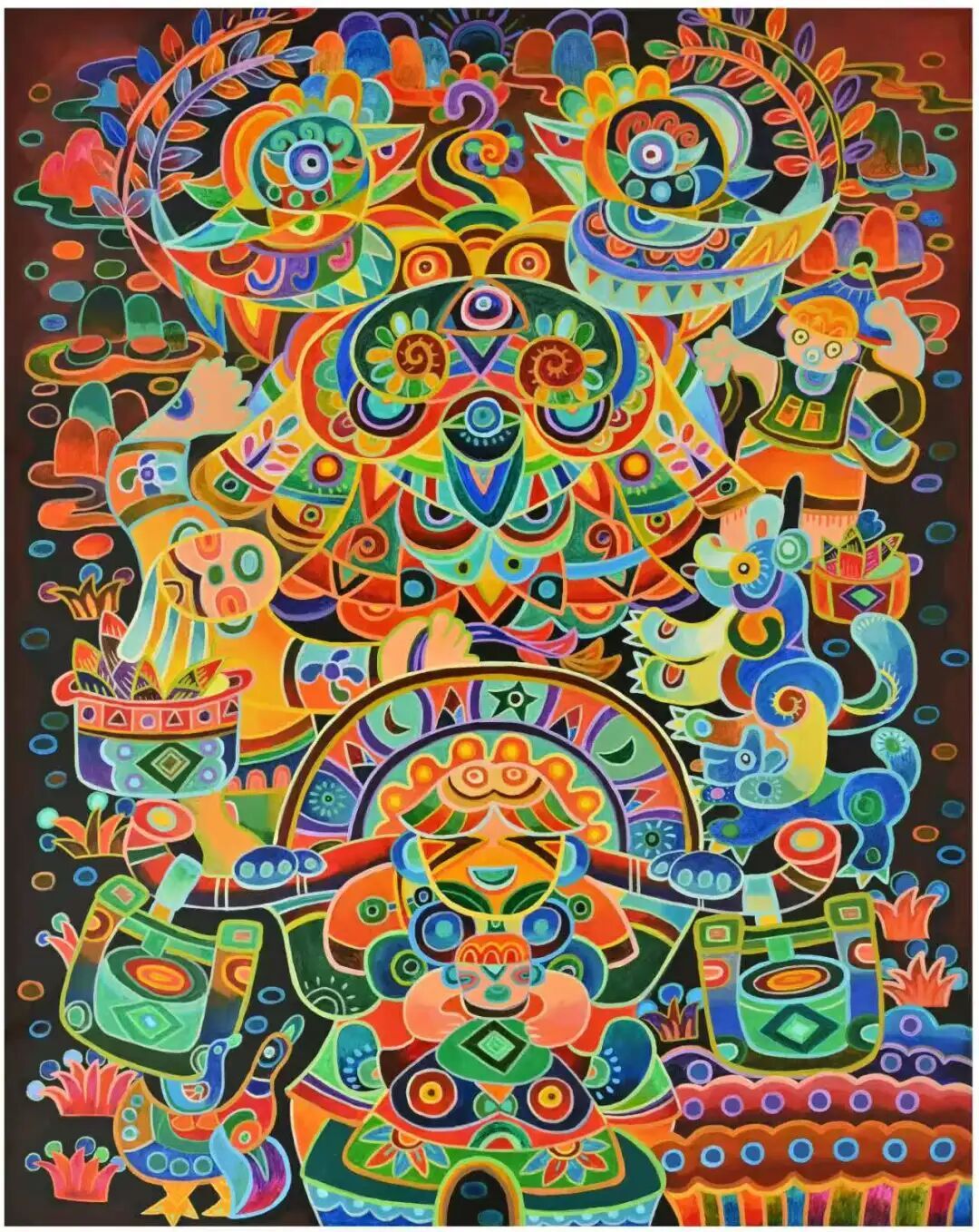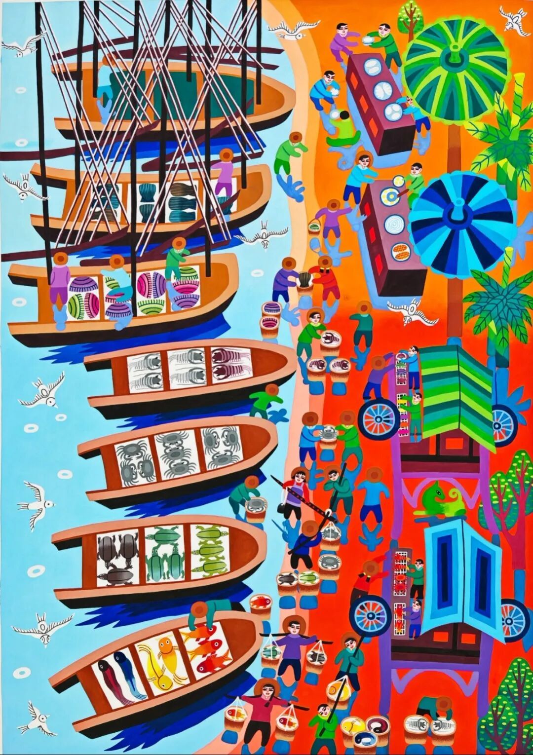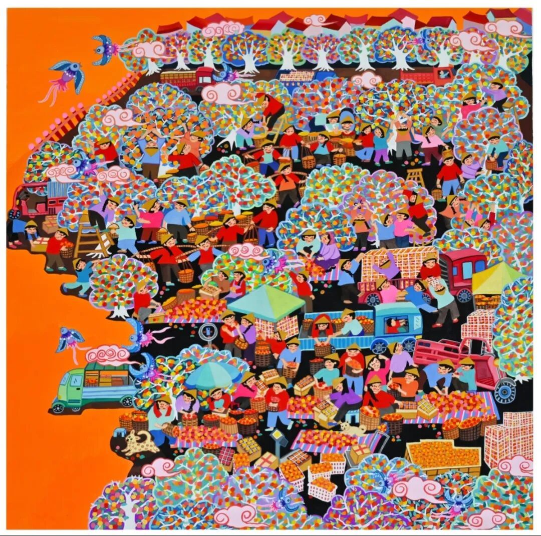 作为“中国现代民间绘画画乡”“中国民间文化艺术之乡”,龙门农民画以浓墨重彩定格生活本真、以质朴笔触传递乡土情怀。此次共有4幅作品入选展览:钟永廉的《丰收路上齐欢唱》、曾宝田的《海滩集市》、温雯慧的《甜桔满枝头》、叶倩的《渔歌颂丰》。这些作品延续了龙门农民画色彩明艳、构图饱满的艺术特色,既聚焦岭南农事节庆、渔乡市集等传统题材,又融入新时代乡村振兴的鲜活气息,将劳动的喜悦、丰收的盛景与对美好生活的向往跃然纸上,成为岭南民俗文化的生动注脚。